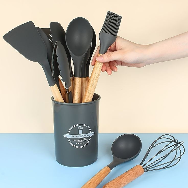 ست کفگیر و ملاقه سیلیکونی دستی چوبی بامبو ۱۲ پارچه