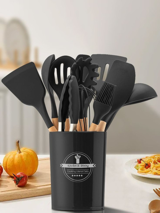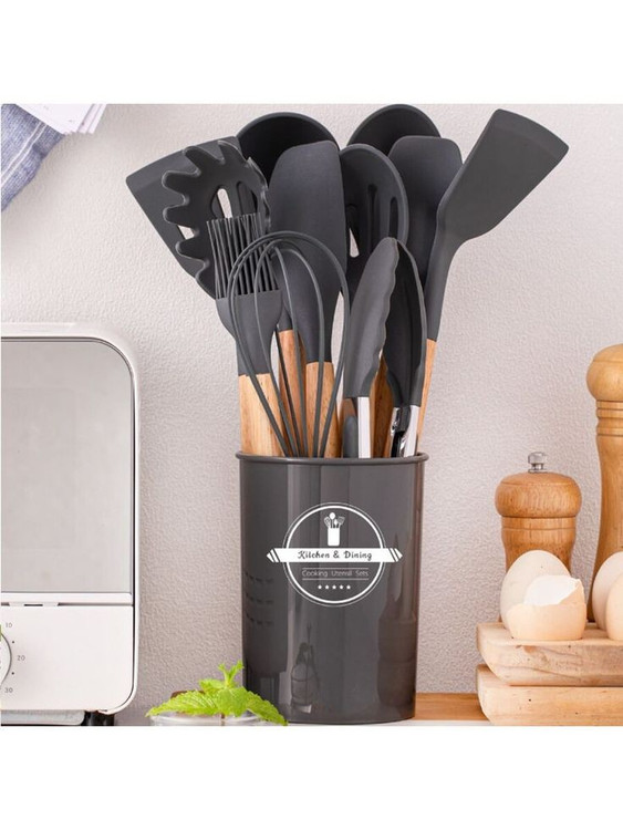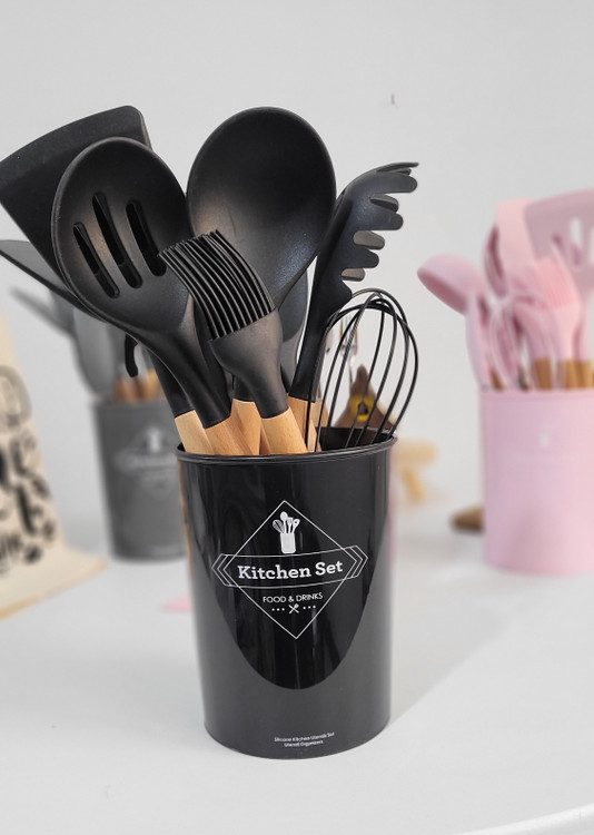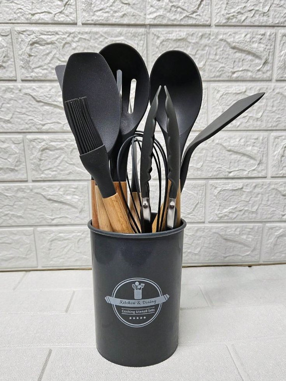 سرویس کفگیر Kitchen Set ساخته شده از با کیفیت ترین مواد سیلیکون با استاندارد FDA و بدون BPM ، دسته های چوبی از جنس بامبو و یک ظرف نگهدارنده از جنس پلاستیک میباشد. این سرویس از وزن متعادل و دیزاین منحصر بفردی برخوردار است که باعث میشود در دست گرفتن آن آسان و پخت و پز را راحت می کند. سیلیکون به کار رفته در این محصول ساخته شده از مواد غیر سمی ، بی بو و سازگار با محیط زیست است. این مجموعه وسایل آشپز خانه در برابر درجه حرارت سرما تا 30- و گرما 230+ درجه سانتی گراد مقاومت دارد.