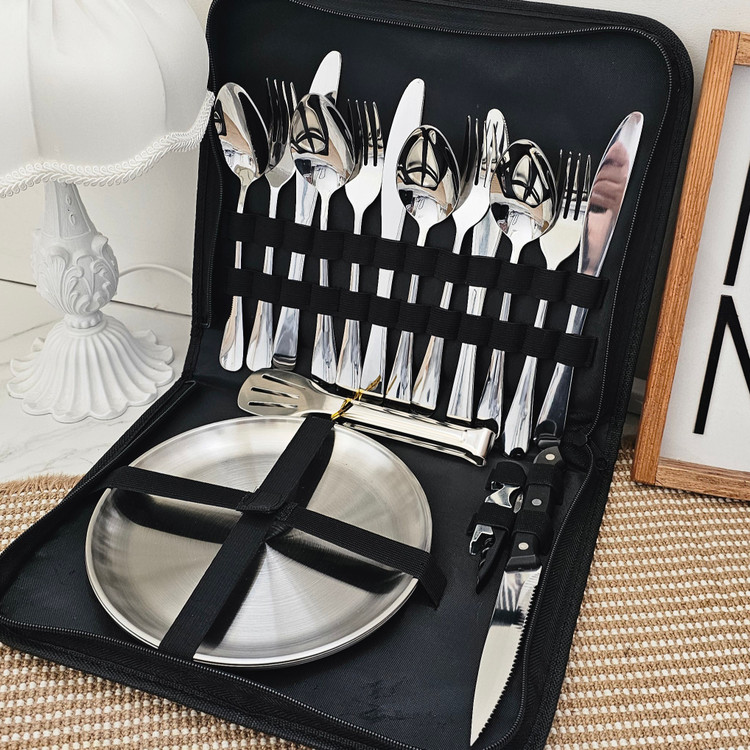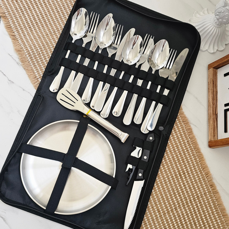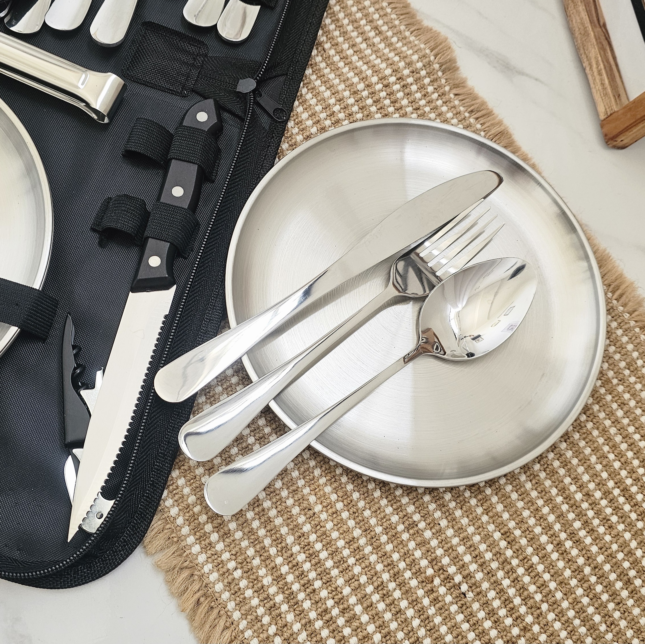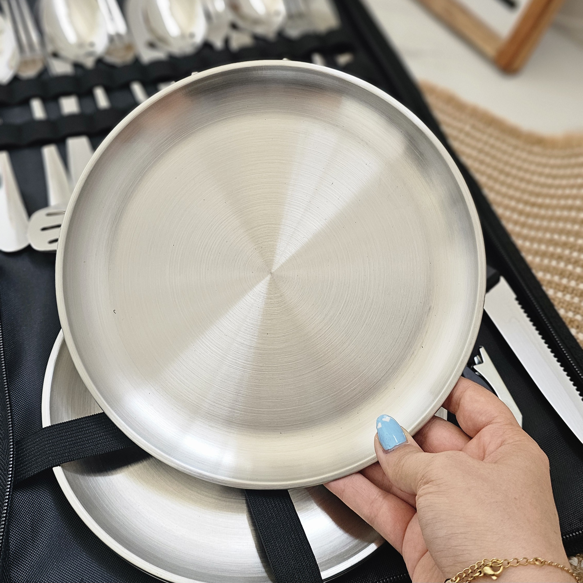 سرویس کامل ظروف کمپینگ استیل 4 نفره 🍃 🍽️ شامل بشقاب، قاشق و چنگال ضدزنگ، طراحی جمعوجور برای سفر و کمپینگ — همراه همیشگی تو در جاده و طبیعت! 🌿