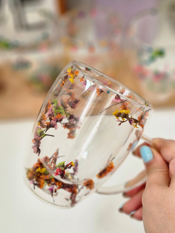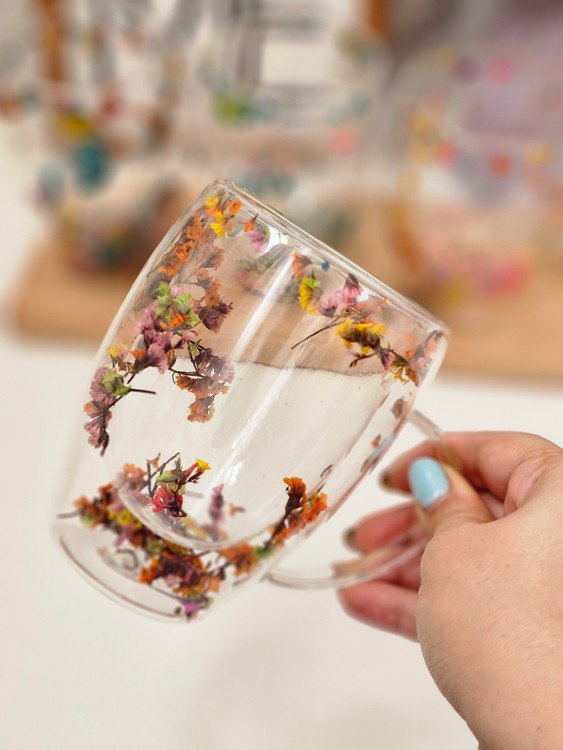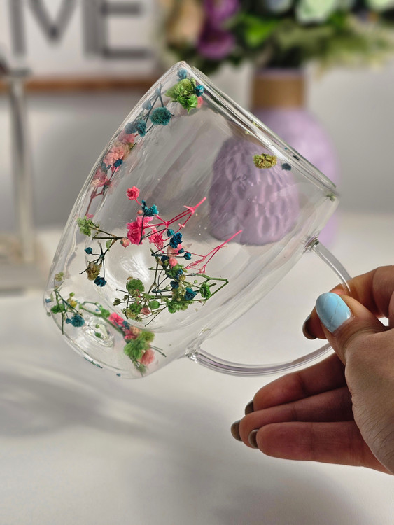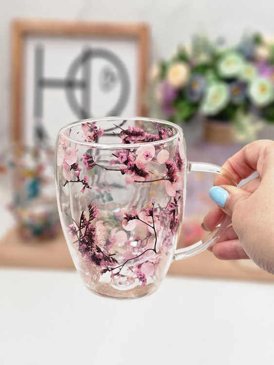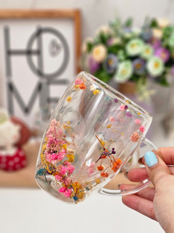جنس پیرکس رنگ گلهای داخل جداره ها بصورت ادغامی میباشد بین دو جدار گلهای خشک وجود دارد که با تکان دادن لیوان حرکت میکنند مناسب جهت سرو انواع نوشیدنی گرم و سرد قابلیت استفاده در منزل، کافیشاپ ابعاد : قطر دهانه 8 سانتیمتر و ارتفاع 12 سانتیمتر